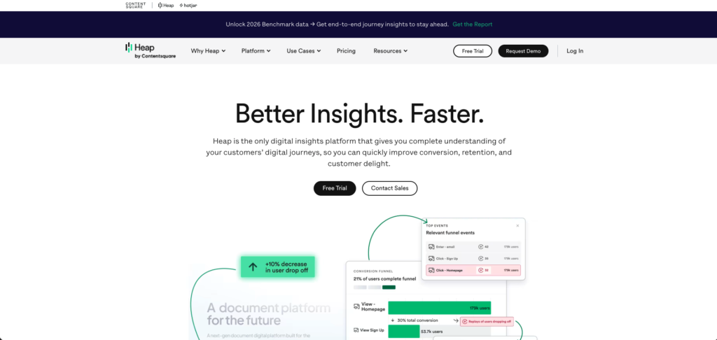 | Heap | Automatic event capture with retroactive analysis capabilities | Teams wanting analytics without event planning | Free up to 10K sessions/mo; Growth from ~$3,600/yr | 4.0/5 |