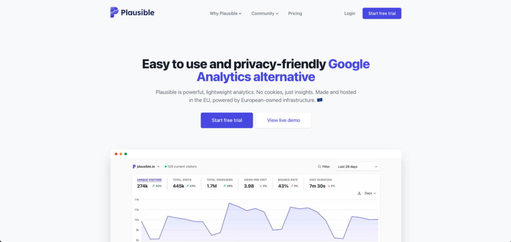 | Privacy-first / EU market | Plausible Analytics | GDPR compliant without cookies, lightweight, EU-hosted data processing |