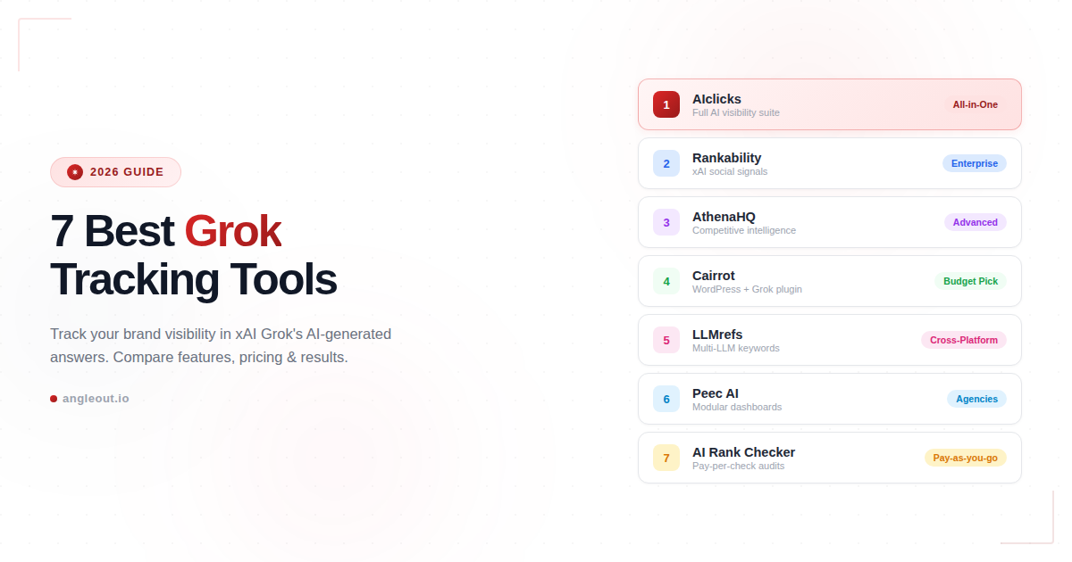 | AIclicks | All-in-one AI visibility platform with prompt-level monitoring, citation intelligence, and geo/language audits across Grok and 5+ other AI engines. | Agencies and brands want deep Grok visibility with actionable optimization recommendations and multi-engine dashboards. | From $39/mo |
