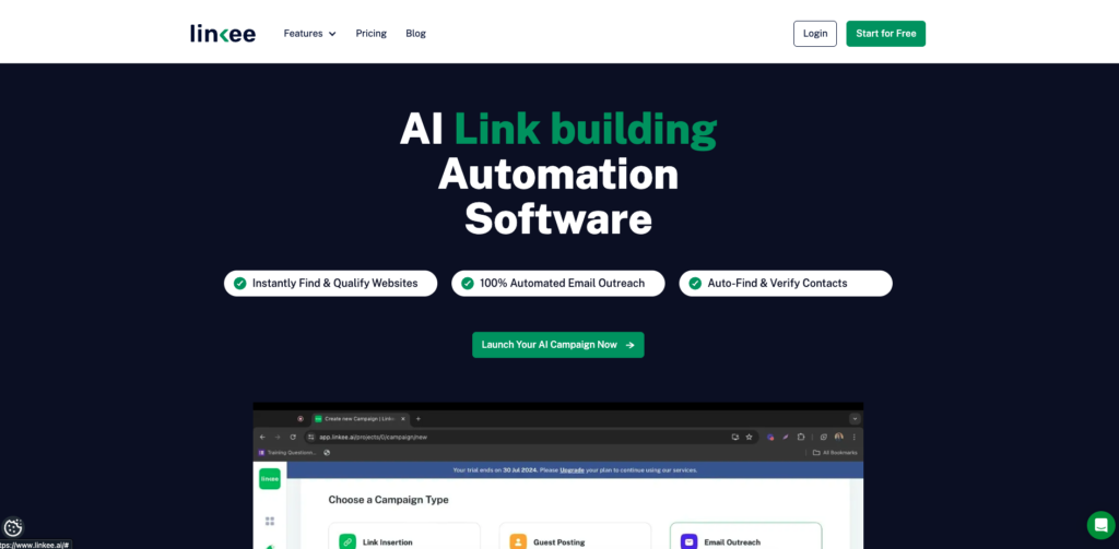 Linkee.ai is one of the more ambitious new entrants in the link-building space. It aims to cover the entire workflow in one platform, from prospect discovery and qualification to email verification and outreach, all powered by AI. It draws from a database of over 5 million pre-vetted websites, analyzing their actual content to understand true topical relevance rather than just surface-level domain metrics.