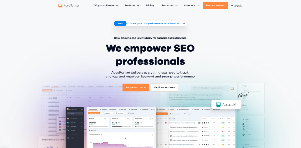 | AccuRanker | Specialized real-time rank tracker with on-demand updates, Share of Voice, SERP feature tracking, and unlimited domains/users on all plans. | Enterprise teams and data-driven agencies need the fastest, most accurate rank updates available. | From $129/mo (1K keywords). Expert $849/mo, Enterprise $2,409/mo. 14-day trial. |