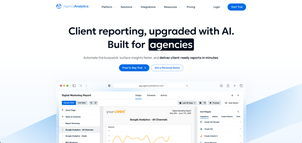 \AgencyAnalytics is designed specifically for agencies that need streamlined reporting across SEO, PPC, social media, and web analytics. It integrates with 80+ platforms, including Semrush, Ahrefs, Moz, Google Analytics, and Search Console, pulling all data into branded, client-ready dashboards. Its white-label system lets you fully brand reports, dashboards, and client portals with your agency identity.