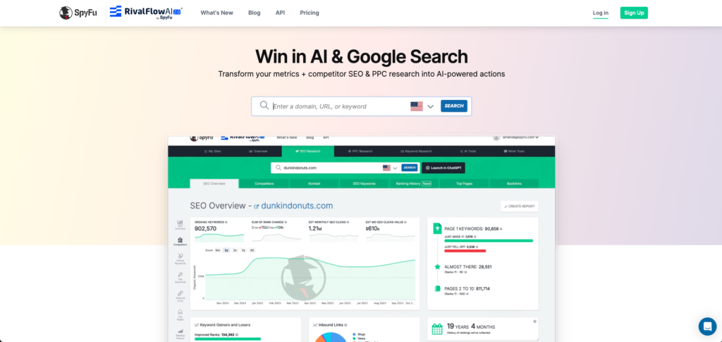 SpyFu is a competitive intelligence platform that specializes in reverse-engineering competitor strategies by providing access to historical keyword data, ad copy, PPC campaign history, and backlink information. With over 9 years of organic ranking and AdWords history, it gives agencies an unmatched view into what’s working for competitors. Its Kombat tool for three-way domain comparisons and RivalFlow AI for identifying content gaps make it a powerful weapon for agencies focused on outranking the competition.