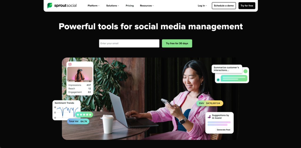 | Sprout Social | Enterprise social media management platform with AI-powered social listening, sentiment analysis, and brand health monitoring across all major social networks. | Large teams needing upstream social intelligence that feeds AI model training data | Standard $199/seat/mo; Professional $299/seat/mo; Advanced $399/seat/mo; Enterprise custom |